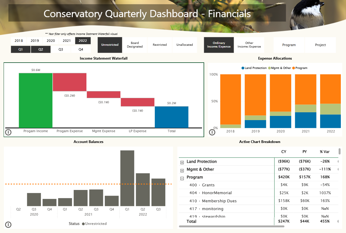This interactive dashboard was designed for a Michigan-based land conservancy that acquires and restores land for forest preserves using donations and grants. The dashboard provides leadership with self-service analytics, live-linked to QuickBooks and refreshed daily, enabling both high-level insights and detailed drill-downs.